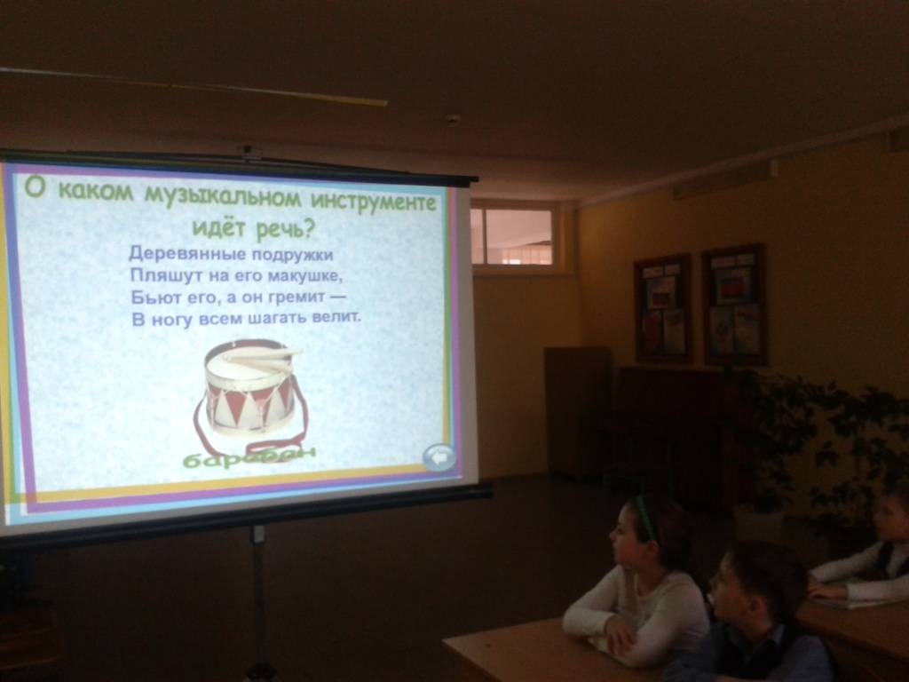 07.03.18 года для учащихся 1-х классов на уроке музыки Яцун Анна Геннадиевна провела интерактивную игру «Угадай мелодию», в ходе которой ребята угадывали мелодии детских песен из категорий «Из мультфильмов», «Из детских фильмов», «Школьные годы чудесные», «О животных», «О друзьях». Все пели под знакомые мелодии и дружно угадывали песни в каждой категории. Также ребята отгадывали анимированный кроссворд «Музыкальные инструменты». Дети не просто угадывали названия инструментов по описанию в загадке, но и слушали их звучание, познакомились с историей создания музыкальных инструментов: скрипки, органа, аккордеона, флейты, домры и др.