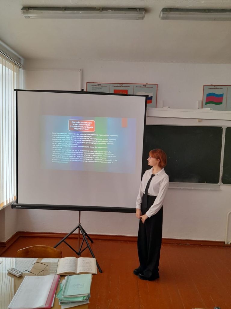 В рамках Недели правовых знаний в 9б классе (кл.рук.Кравченко П.А.) прошёл классный час на тему « Осторожно, терроризм». Учащиеся подготовили презентации и познакомили своих товарищей с правилами поведения во время захвата в заложники, как себя вести при освобождении и т.д.