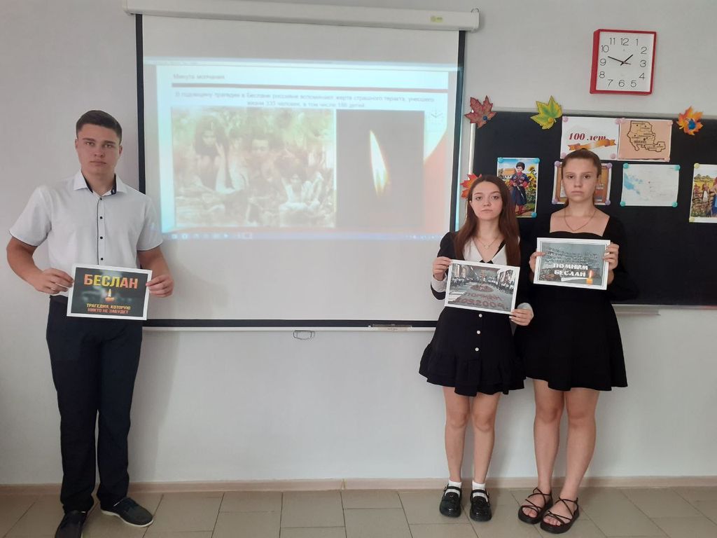 1-3 сентября 2004 года стали самой трагической датой в истории современной России – в этот день в небольшом городе Беслане Республики Осетия-Алания произошёл теракт, унёсший 334 жизней, 186 из них – дети. Более 800 человек были ранены, 72 ребенка остались инвалидами. 3 сентября ко Дню солидарности в борьбе с терроризмом кл.рук. 10 "Б" класса Яцун А.Г. провела час памяти «Беслан: 20 лет трагедии». Вместе с ребятами вспомнили что такое терроризм, поговорили о террористических актах, как нужно вести себя при захвате в заложники. Особое внимание было уделено страшной трагедии Беслана.